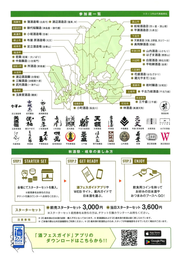 足立酒造場(金華山) / 岩村醸造(女城主) / 奥飛騨酒造(初緑) / 蒲酒造場(白真弓) / 玉泉堂酒造(醴泉・美濃菊) / 蔵元やまだ(玉柏) / 小坂酒造場(百春) / 小町酒造(長良川) / 武内酒造(美濃紅梅) / 千古乃岩酒造(千古乃岩) / 天領酒造(天領 日野屋) / 所酒造(房島屋) / 中島醸造(小左衛門) / 布屋 原酒造場(元文) / 白扇酒造(黒松白扇) / はざま酒造(恵那山) / 花盛酒造(はなざかり) / 林酒造(美濃天狗) / 平瀬酒造店(久寿玉) / 舩坂酒造店(四ッ星・深山菊) / 平和錦酒造(金泉) / 三千盛(三千盛) / 御代桜醸造(津島屋) / 三輪酒造(白川郷) / 山内酒造(ふかもり) / 若葉(若葉・大いばり) / 渡辺酒造醸(白雪姫) / 渡辺酒造店(蓬莱・W)※10/25(土)のみ出店