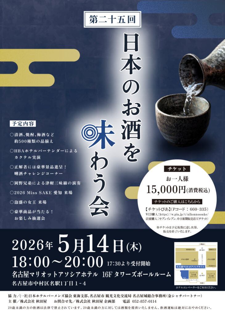 「日本のお酒を楽しむ会」が、名古屋マリオットアソシアホテルを会場に、7年振りに開催されます。