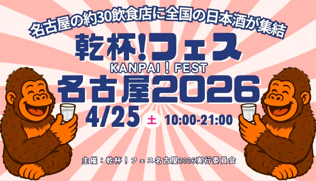 名古屋市内の飲食店をハシゴしながら、美味しい日本酒を楽しむイベント「乾杯!フェス名古屋2026」が2026年4月25日(土)に開催されます。2025年9月に続いて2回目の開催となります。今回は名古屋の名駅、那古野、伏見エリアから30の飲食店が参加。各店舗で異なる酒蔵の日本酒とおつまみを味わうことができます。